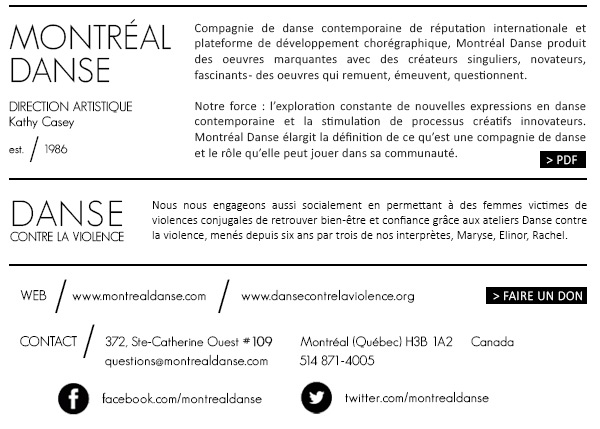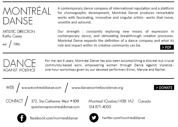 INFOS | Les conférences se tiennent au Département de danse de l'UQAM de 9h30 à 11h | 5$ par conférence | 840, rue Cherrier, Montréal / métro Sherbrooke | Merci de réserver à l’avance à communications@montrealdanse.com
